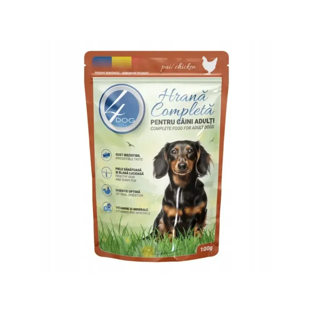 | Descriere scurta | 4DOG aduce in dieta cainelui tau o hrana umeda completa pentru caini, cu bucati delicioase de carne de pui in sos. Hrana umedă de la 4DOG este ideală pentru câinii care preferă o consistență moale și savuroasă, oferind în același timp hidratarea suplimentară necesară. Formula sa oferă un aport de vitamine și minerale, esențiale pentru o masa completa si un gust irezistibil. Beneficii: