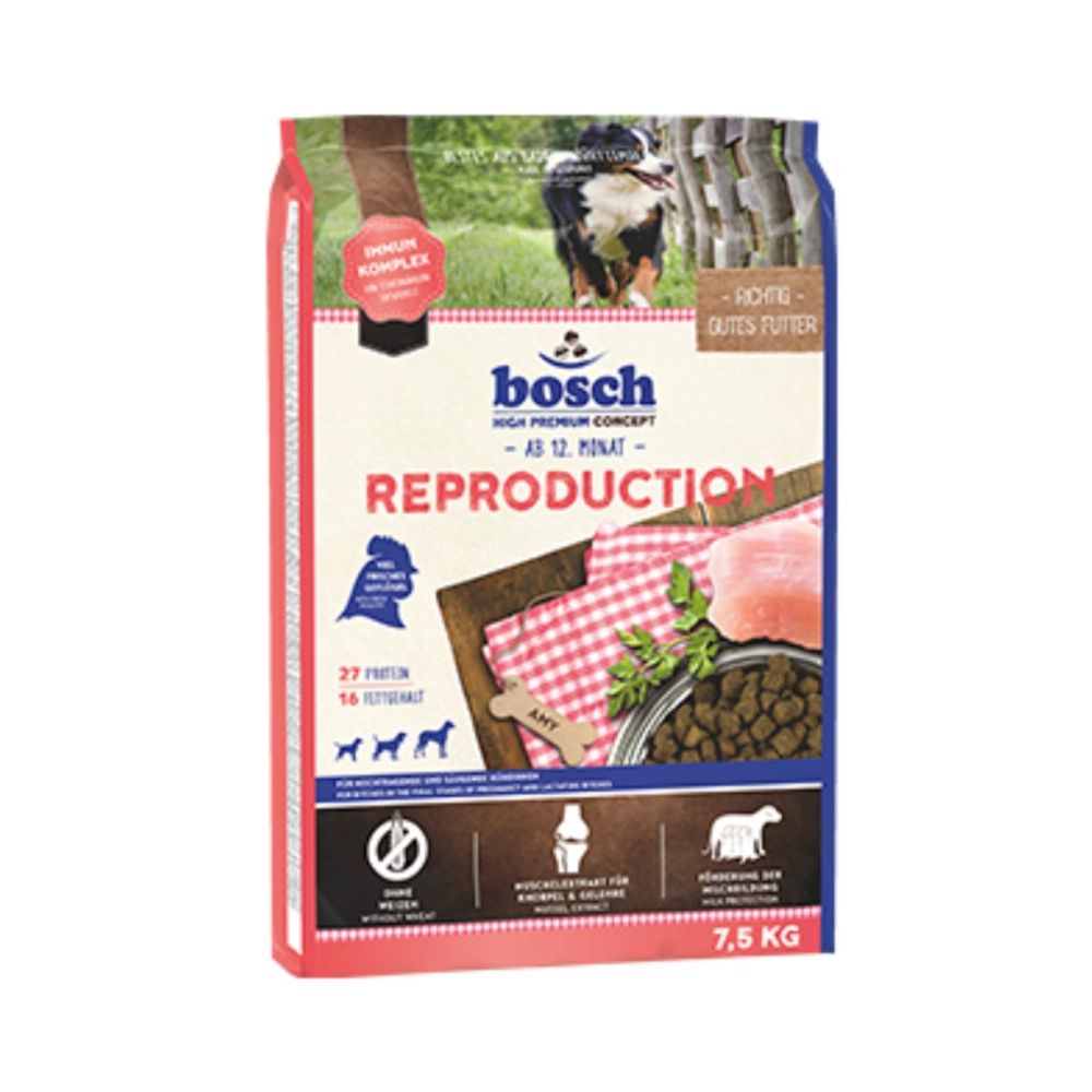 | Descriere scurta | Hrana uscata pentru caini Bosch Reproduction 7.5 kg asigura o alimentatie completa cateluselor gestante si care alapteaza din cea de-a cincea saptamana de sarcina. Beneficii: