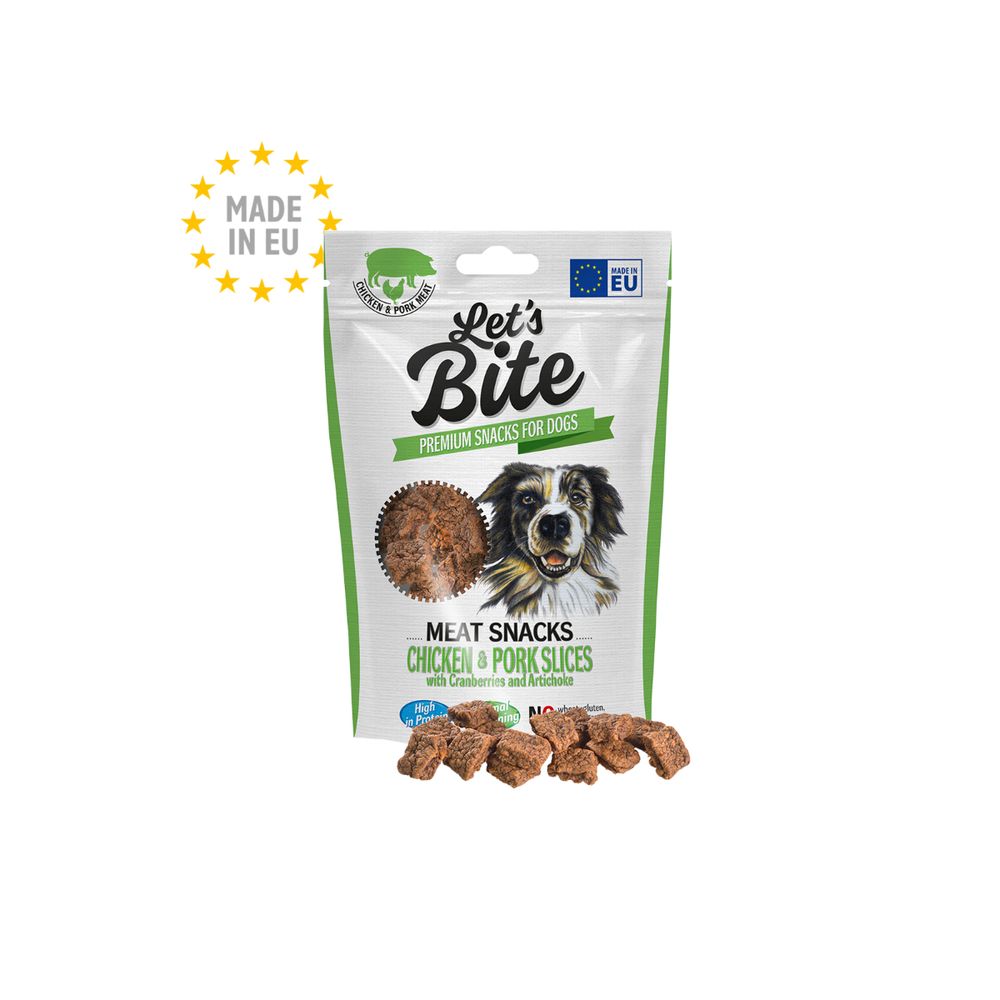 | Descriere scurta | Let's Bite Meat Snacks Chicken & Pork slices cu afine și anghinare sunt gustări delicate din carne de pui si porc pentru toți iubitorii de carne canini. Aceste delicii sunt ideale pentru antrenament, ca recompensă sau pur și simplu ca un răsfăț gustos. Recompensele din carne sunt cheia ascultării și susțin instinctul natural de mestecat al câinilor. Beneficii: