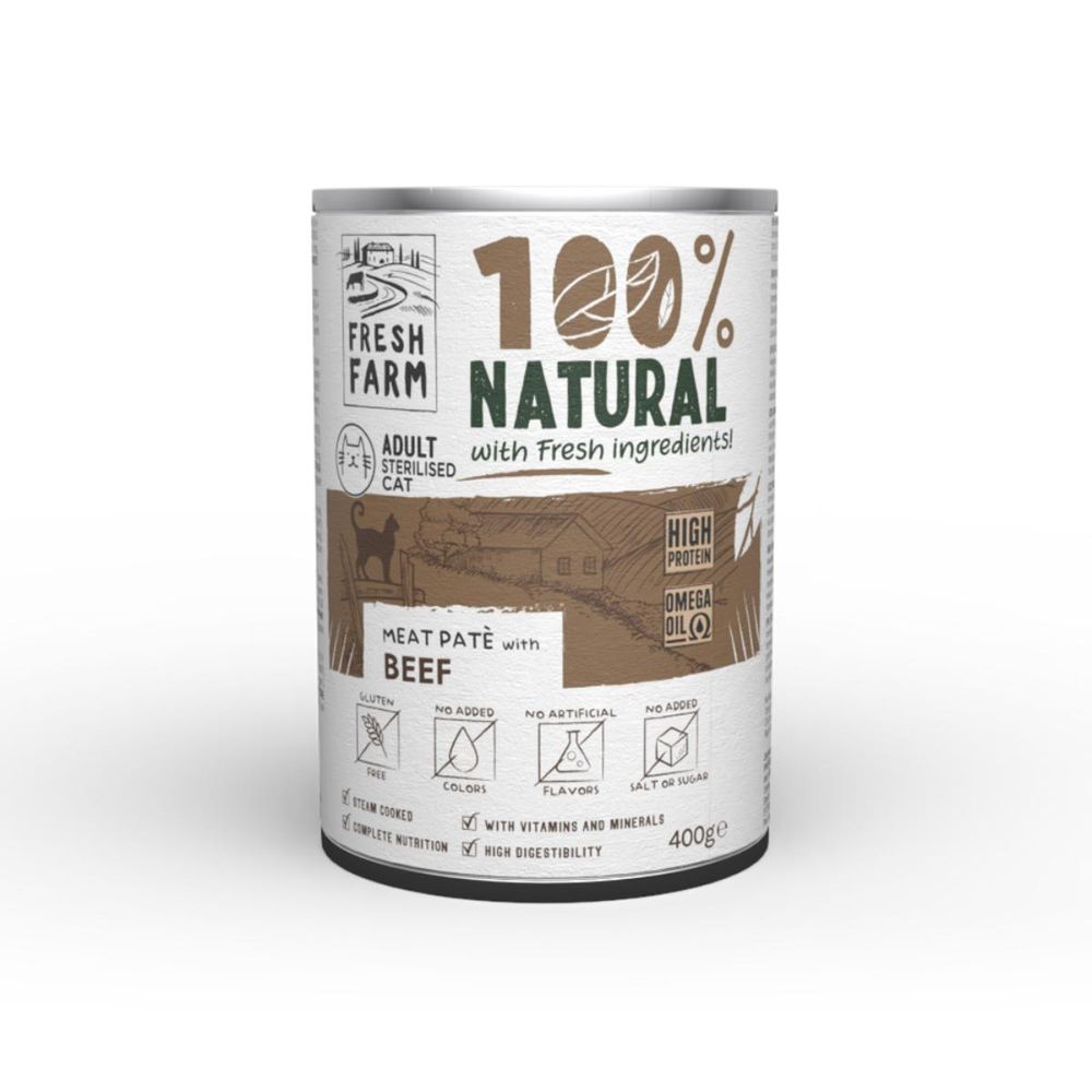 | Descriere scurta | FRESH FARM este o hrană umedă special creată pentru a satisface cele mai rafinate gusturi și a sprijini sănătatea optimă a felinei tale sterilizate. Preparată cu ingrediente proaspete și naturale, această rețetă oferă un conținut ridicat de carne, asigurând proteine de înaltă calitate esențiale pentru o musculatură puternică și o viață activă. Textura fină de mousse transformă fiecare masă într-o experiență delicioasă, ușor de consumat chiar și de către pisicile sterilizate cu nevoi mai speciale sau sensibilități alimentare. Gătită la aburi pentru a păstra toate proprietățile nutritive, FRESH FARM Smooth Sterilised este îmbogățită cu ulei de somon, contribuind la o stare generală de bine și la un sistem urinar si imunitar puternic. Fără gluten coloranți sau arome artificiale, această conservă ofera un echilibru ideal între nutriție și gust, fiind alegerea perfectă pentru a răsfăța și a menține sănătatea pisicii tale! Beneficii: