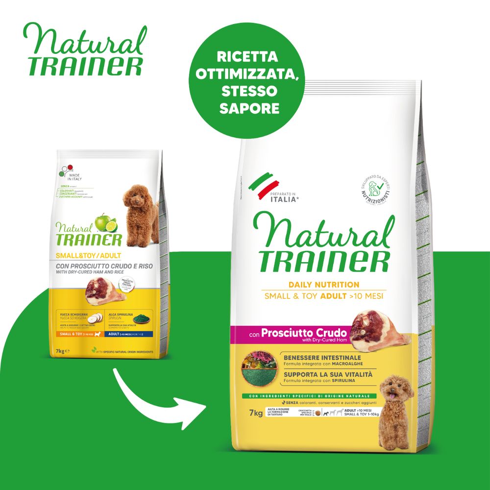 | Descriere scurta | Natural Trainer cu Prosciutto Crudo este o hrană completă și echilibrată, concepută special pentru câinii adulți de talie mică și foarte mică (1–10 kg), cu vârsta de peste 10 luni. Rețeta este formulată cu ingrediente atent selecționate pentru a răspunde nevoilor nutriționale specifice ale câinilor mici, oferindu-le energia și suportul necesar unei vieți active. Prosciutto Crudo oferă un gust delicios, iar aportul optim de nutrienți susține o stare generală de bine. Hrana este îmbogățită cu un amestec de prebiotice care includ macroalge, contribuind la sănătatea florei intestinale și la o digestie echilibrată. Spirulina adăugată susține vitalitatea și nivelul de energie al câinelui adult, în timp ce o combinație specială de minerale ajută la reducerea formării tartrului, sprijinind astfel sănătatea dentară. Natural Trainer este alegerea perfectă pentru câinii de talie mică ce au nevoie de o nutriție completă, echilibrată și gustoasă. Beneficii: