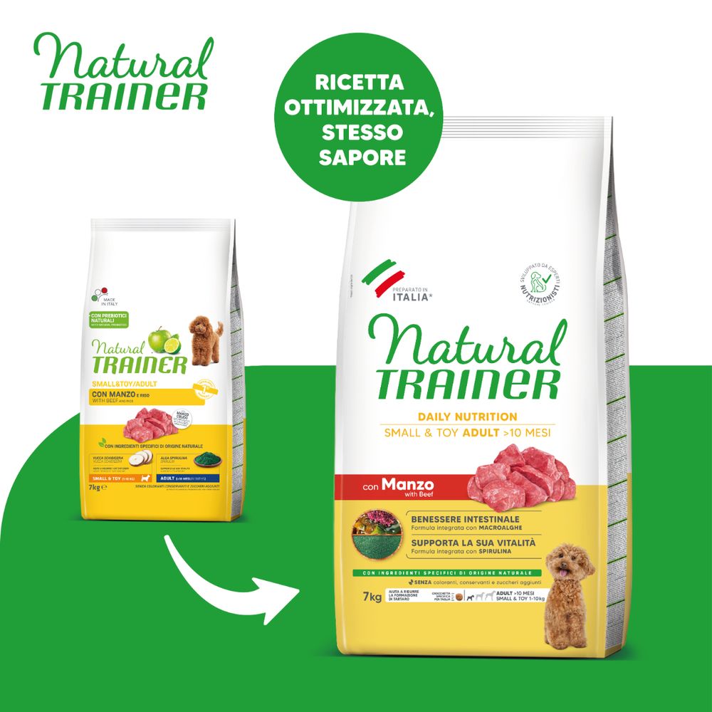 | Descriere scurta | Natural Trainer cu vită este o hrană completă și echilibrată, concepută special pentru câinii adulți de talie mică și foarte mică (1–10 kg), cu vârsta de peste 10 luni. Rețeta este formulată cu ingrediente atent selecționate pentru a răspunde nevoilor nutriționale specifice ale câinilor mici, oferindu-le energia și suportul necesar unei vieți active. Carnea de vită oferă un gust delicios, iar aportul optim de nutrienți susține o stare generală de bine. Hrana este îmbogățită cu un amestec de prebiotice care includ macroalge, contribuind la sănătatea florei intestinale și la o digestie echilibrată. Spirulina adăugată susține vitalitatea și nivelul de energie al câinelui adult, în timp ce o combinație specială de minerale ajută la reducerea formării tartrului, sprijinind astfel sănătatea dentară. Natural Trainer cu vită este alegerea perfectă pentru câinii de talie mică ce au nevoie de o nutriție completă, echilibrată și gustoasă. Beneficii: