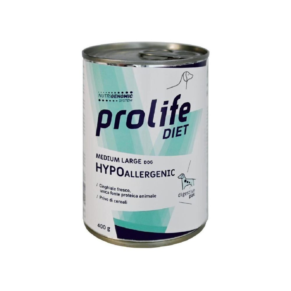 | Descriere scurta | Prolife Hypoallergenic Medium & Large este o hrană dietetică completă pentru câini adulți de talie mijlocie și mare, formulată special pentru a reduce intoleranța la ingrediente și nutrienți. Această rețetă fără cereale conține carne de mistreț proaspătă, o sursă superioară de proteine de înaltă calitate, ce asigură un aport optim de aminoacizi esențiali pentru menținerea masei musculare și a energiei. În plus, uleiul de cânepă, o sursă excelentă de acizi grași Omega 3 și Omega 6, ajută la reducerea inflamației și susține sănătatea pielii și a blănii. Dovleacul, ca sursă de carbohidrați ușor digerabili, sprijină digestia și contribuie la menținerea unui tract intestinal sănătos. Acesta este un aliment ideal pentru câinii sensibili, oferind o nutriție echilibrată fără a risca reacții alergice sau intoleranțe. Beneficii: