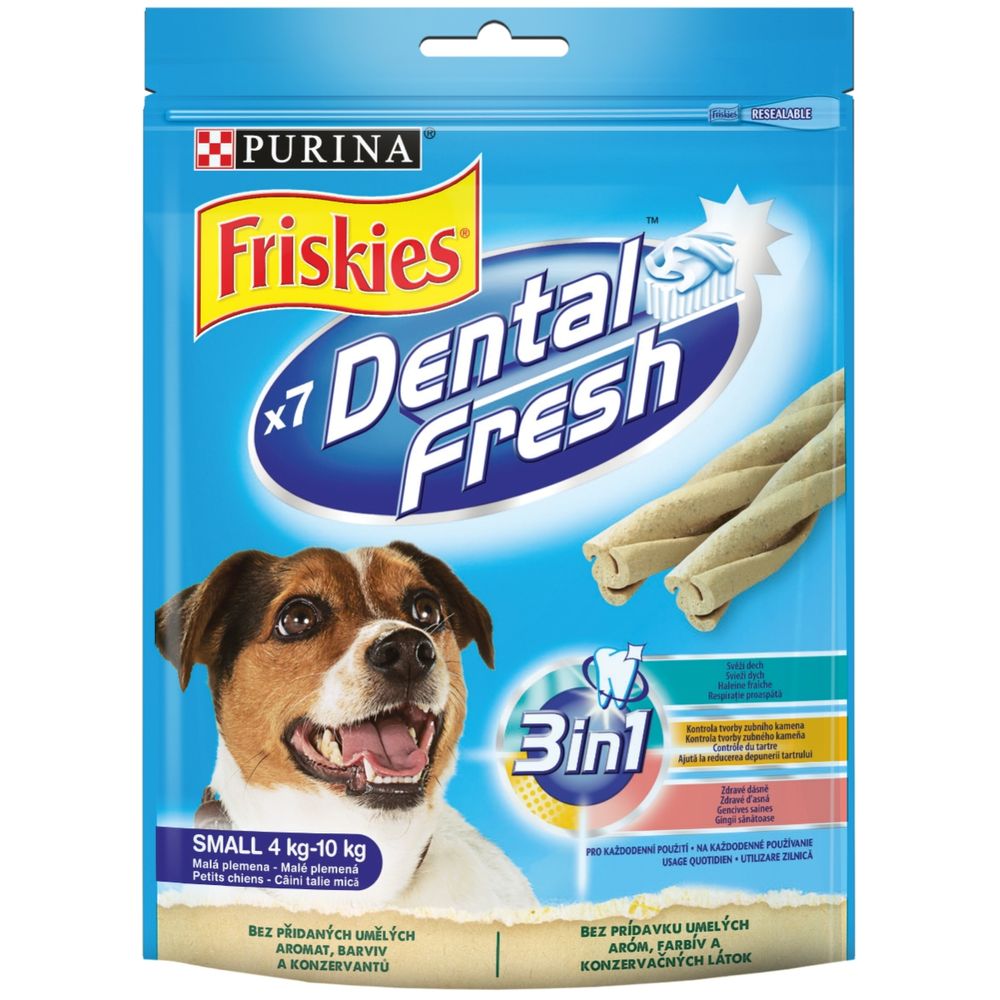 Îngrijirea dentară zilnică e foarte importantă pentru câini. Friskies Dental Fresh ajută la menținerea sănătății dinților și gingiilor și ajută la reducerea formării plăcii dentare cu până la 80% datorită ingredientelor active și a texturii speciale.