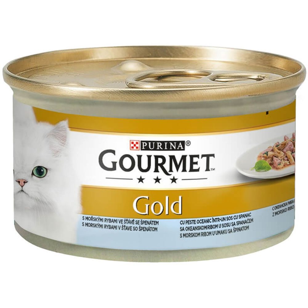 | Descriere scurta | GOURMET Gold Double Pleasure, cu pește oceanic și spanac în sos, este o conservă de hrană umedă pentru pisicile adulte.