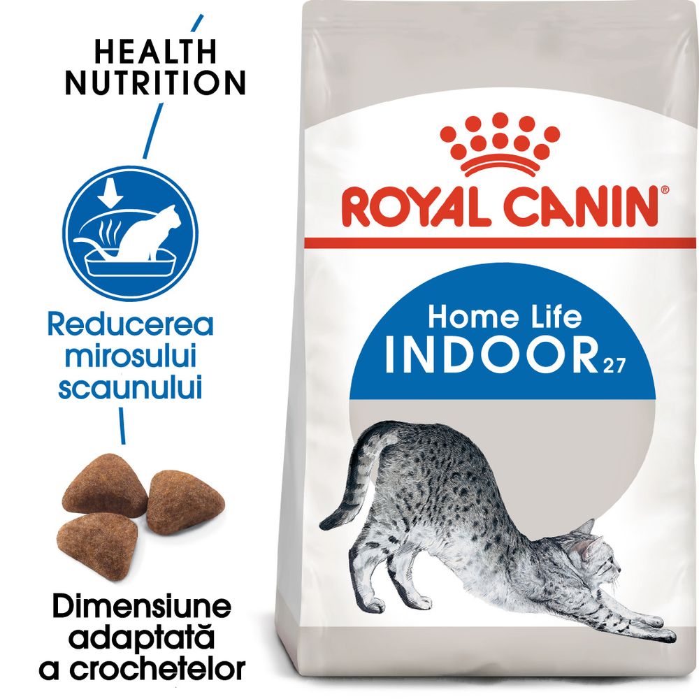 | Descriere scurta | Pisicile adulte de interior, așa cum este și pisica dumneavoastră, fac mai puțină mișcare decât pisicile care stau la exterior și, de aceea, o hrană echilibrată și completă care să conțină nutrienți benefici este importantă pentru o sănătate optimă. Formula nutrițională ROYAL CANIN® Indoor 27 conține proteină foarte ușor digerabilă (L.I.P.) selectată special datorită digestibilității sale foarte ridicate. Această proteină contribuie la reducerea volumului scaunelor pisicii, precum și la diminuarea mirosului neplăcut al acestora care poate să apară atunci când pisicile au un tranzit intestinal mai scăzut din cauza lipsei de activitate fizică. Această hrană are un conținut moderat de lipide, pentru a garanta că aportul caloric destinat pisicii corespunde nivelului său de activitate, conținutul caloric contribuie totodată la menținerea unei greutăți optime. Adesea pisicile de interior își petrec perioade îndelungate de timp îngrijindu-și blana. Datorită includerii unor fibre alimentare specifice, cum ar fi psyllium, această hrană stimulează totodată eliminarea părului ingerat, rezultatul fiind o reducere semnificativă a cantității bezoarelor. Beneficii: