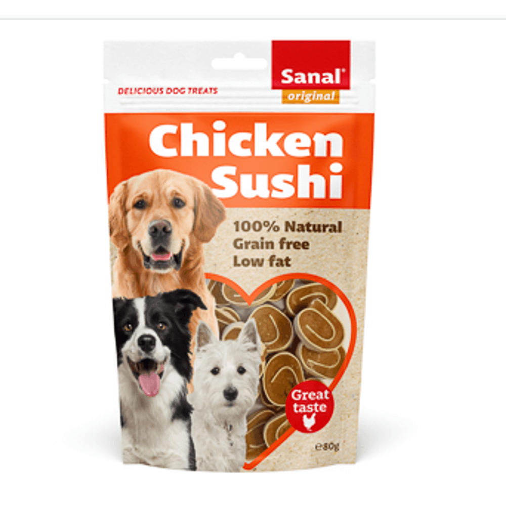 | Descriere scurta | Sanal Caine cu Sushi de Pui, 80 g vor deveni recompensele preferate ale cainelui tau.Recompense delicioase de pui si peste. Beneficii: