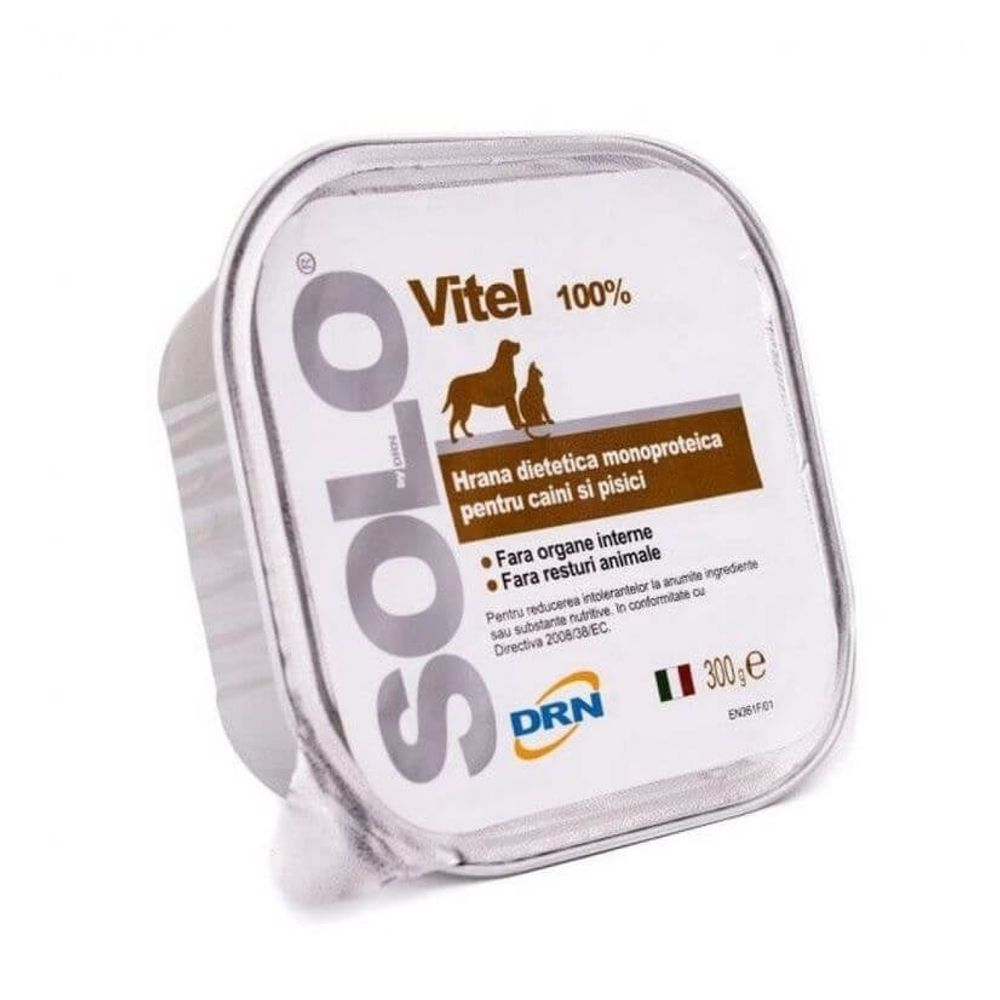 | Descriere scurta | DRN Solo Dog Cat cu Vitel este o hrana umeda dietetica monoproteica pentru caini si pisici. Se recomanda atunci cand este necesara o masa apetisanta, cu un continut proteic usor digerabil si valoare biologica ridicata. Indicata in mod special pentru dietele de excludere a intolerantelor alimentare la anumite surse proteice. Contactati medicul veterinar inainte de folosirea sau prelungirea utilizarii acestui produs, deoarece pot aparea schimbari de dozaj sau mod de folosire in functie de simptomele individuale ale animalului.