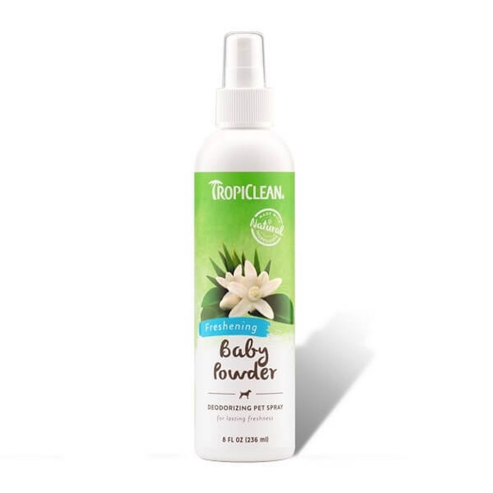 | Descriere scurta | Spray TropiClean Baby Powder pentru caini, pisici si alte animale de companie, ofera un miros proaspat care dureaza cateva zile. Animalutul de companie va arata si mirosi ca si cum a facut baie. Baby Powder adauga prospetime suplimentara blanii animalului, dupa baie sau intre bai. Spray-ul poate fi folosit pe caini, pisici, dihori, hamsteri, iepuri si alte animale mici. TropiClean Baby Powder elimina mirosul de la sursa, lasand in urma un parfum proaspat si placut. Aplicati cateva pulverizari pe blana animalului si bucurati-va de un prieten blanos frumos mirositor.